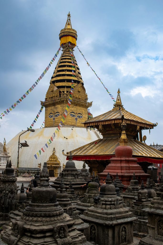 It is thought that after a Bodhisattva named Manjushree cut a George at Chovar, a lotus flower gave birth to Swoyambhu, which translates to “self-created.” The four eyes on the Buddhist chaitya’s four sides represent wisdom and compassion, while the dome-shaped figure represents the world.