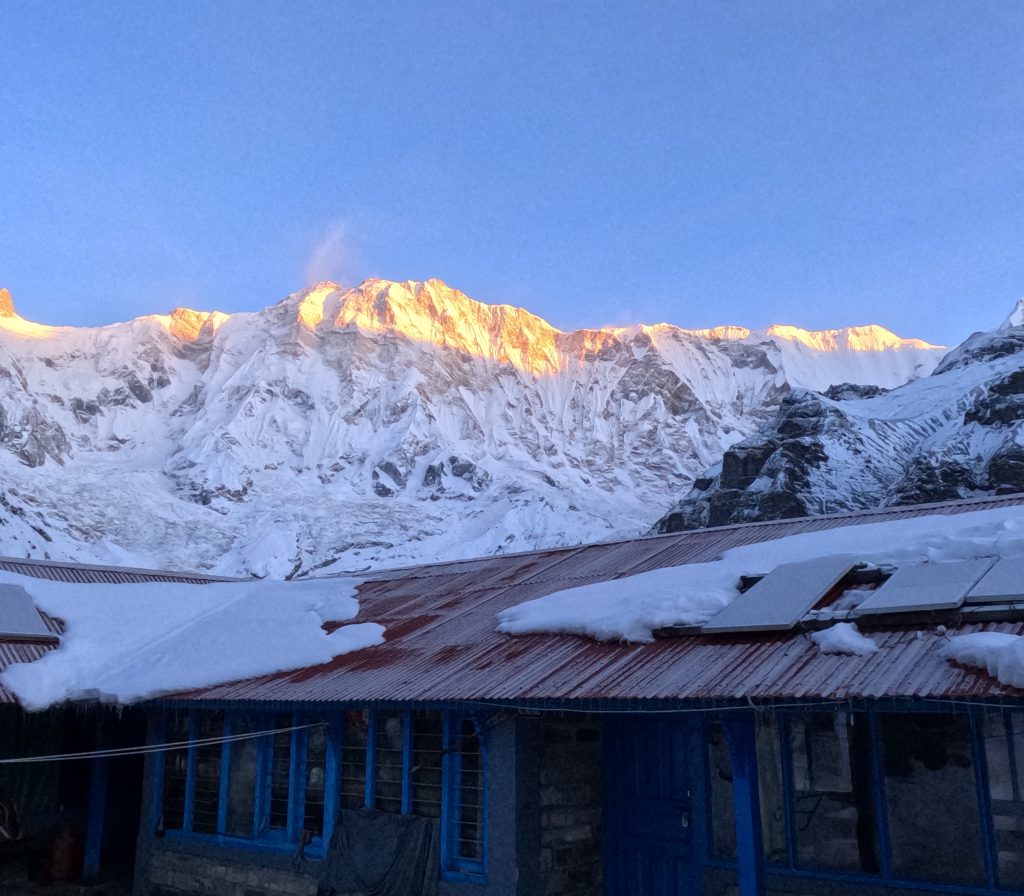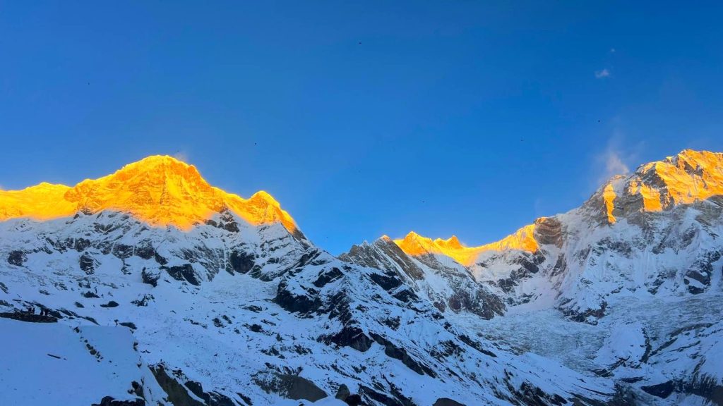 One of the best moments is seeing the sunrise at Annapurna Base Camp, when golden light hits the snowy mountains and creates a beautiful, unforgettable view.