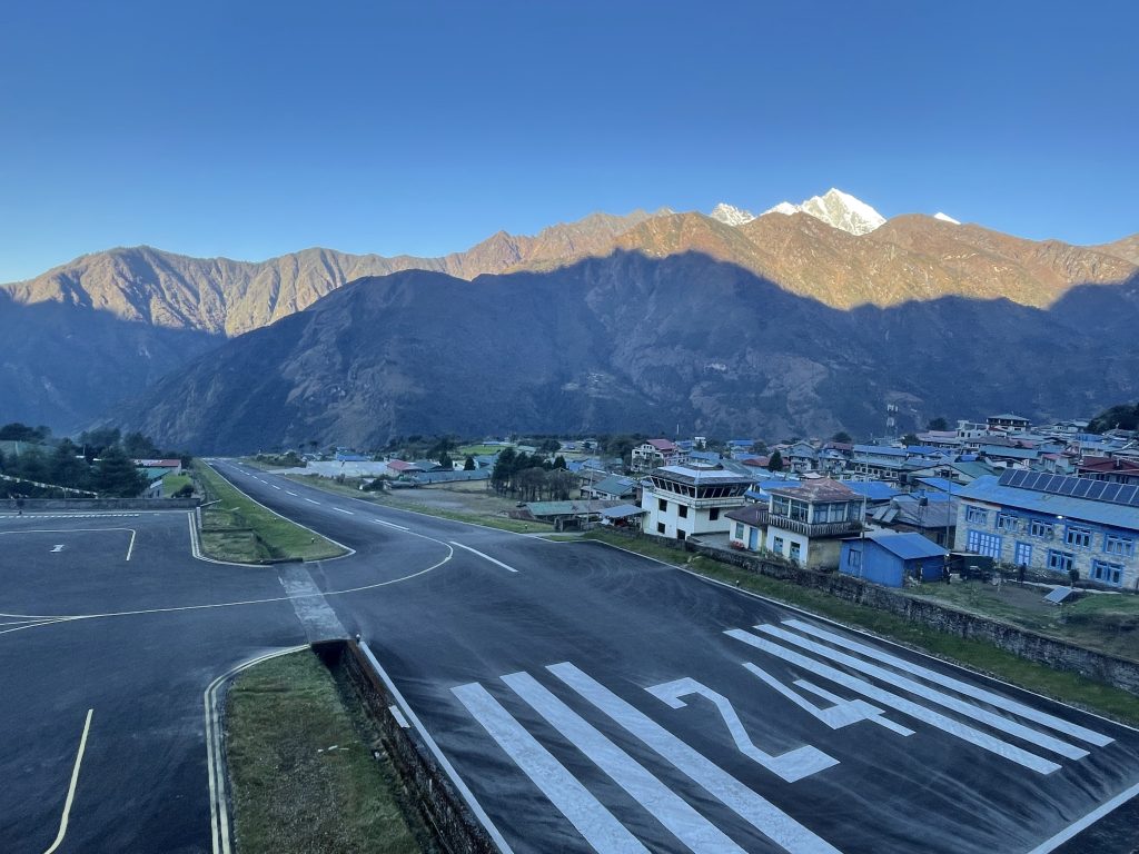 During air enjoy a super panorama of the Himalayan mountain range with Mt. Everest and beautiful Nepalese country landscapes. As the plane hits the runway to a parking area at Lukla airstrip. The airport named after Tenzing and Hillary to make the first ascent on top of Mt. Everest on May 29th, 1953.